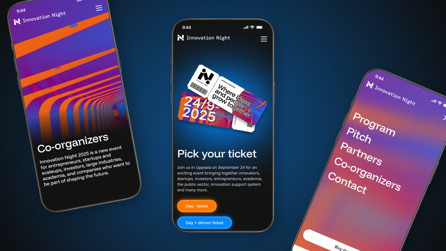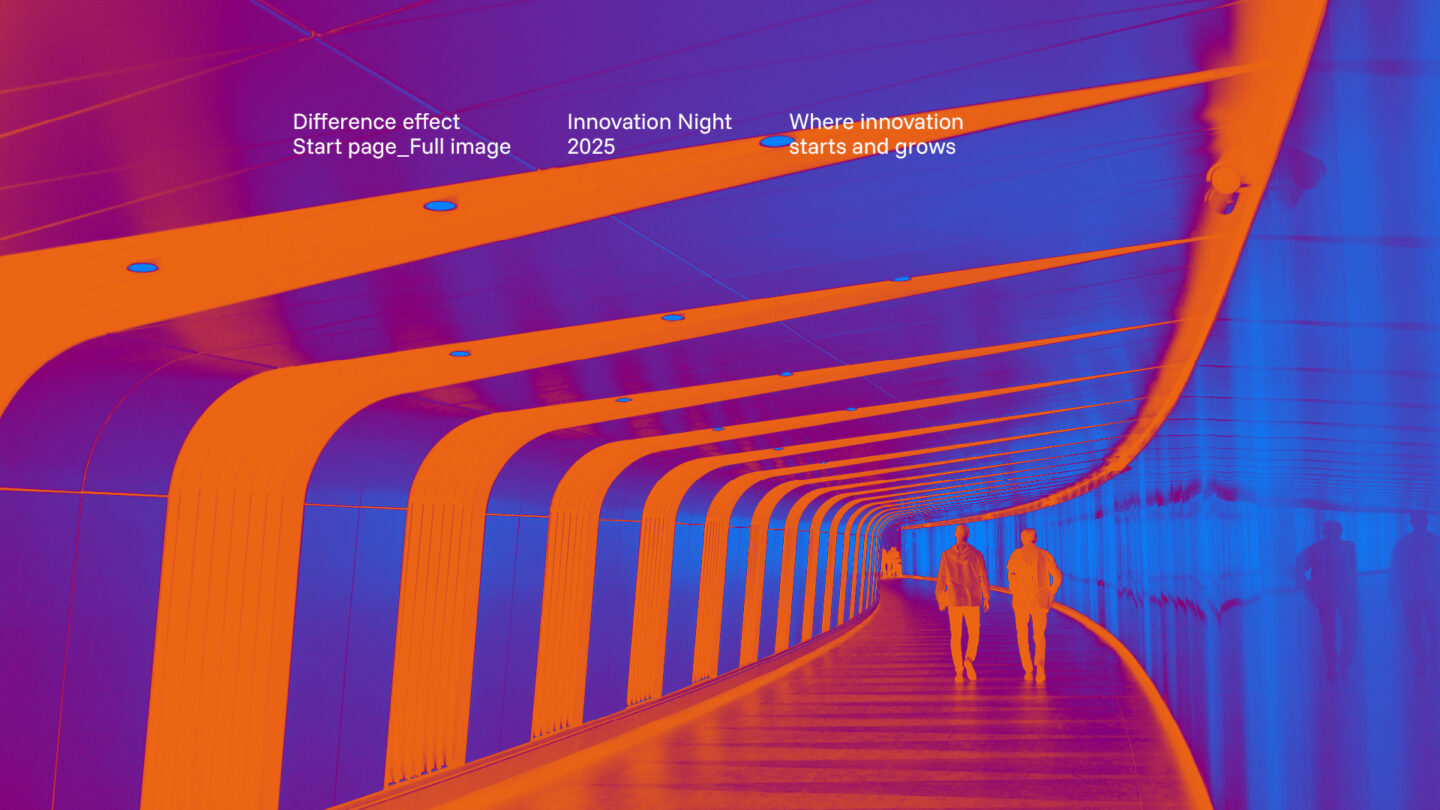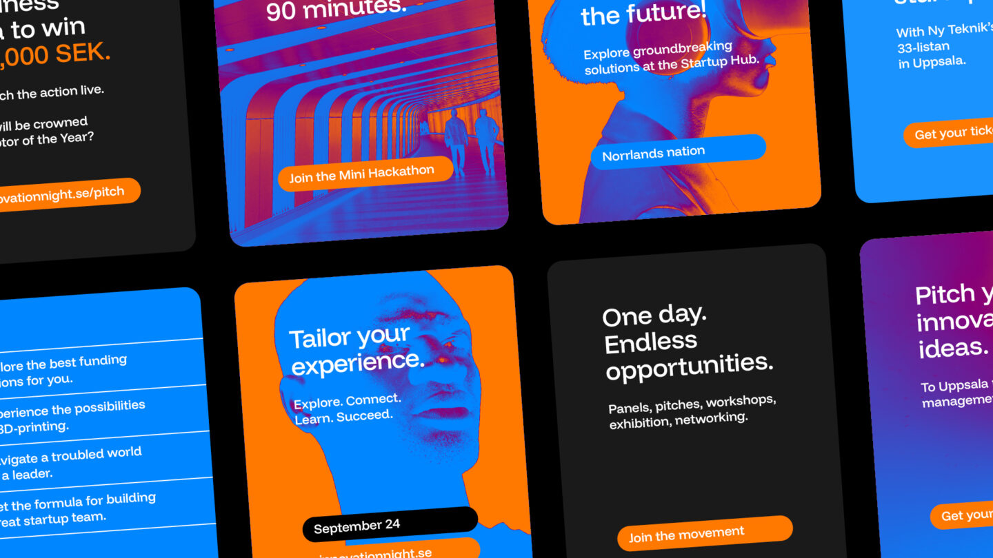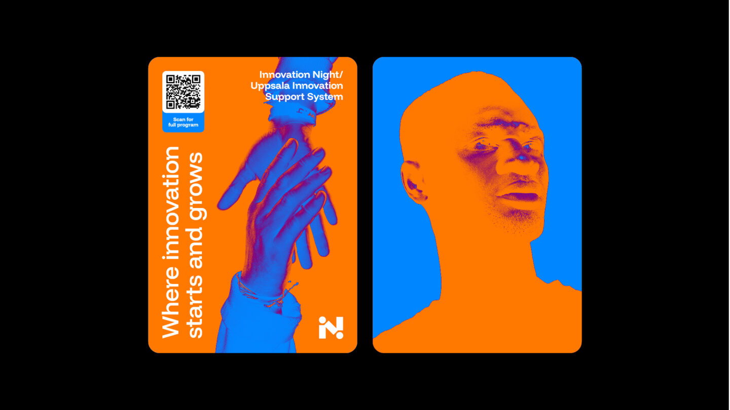 Utforska hur Innovation Nights identitet tar form i färg, form och kontrast. Här möts orange och blå i ett livfullt samspel, logotypens kedja av möten knyter ihop helheten, och den mörka bakgrunden ger uttrycket en tydlig galakänsla.