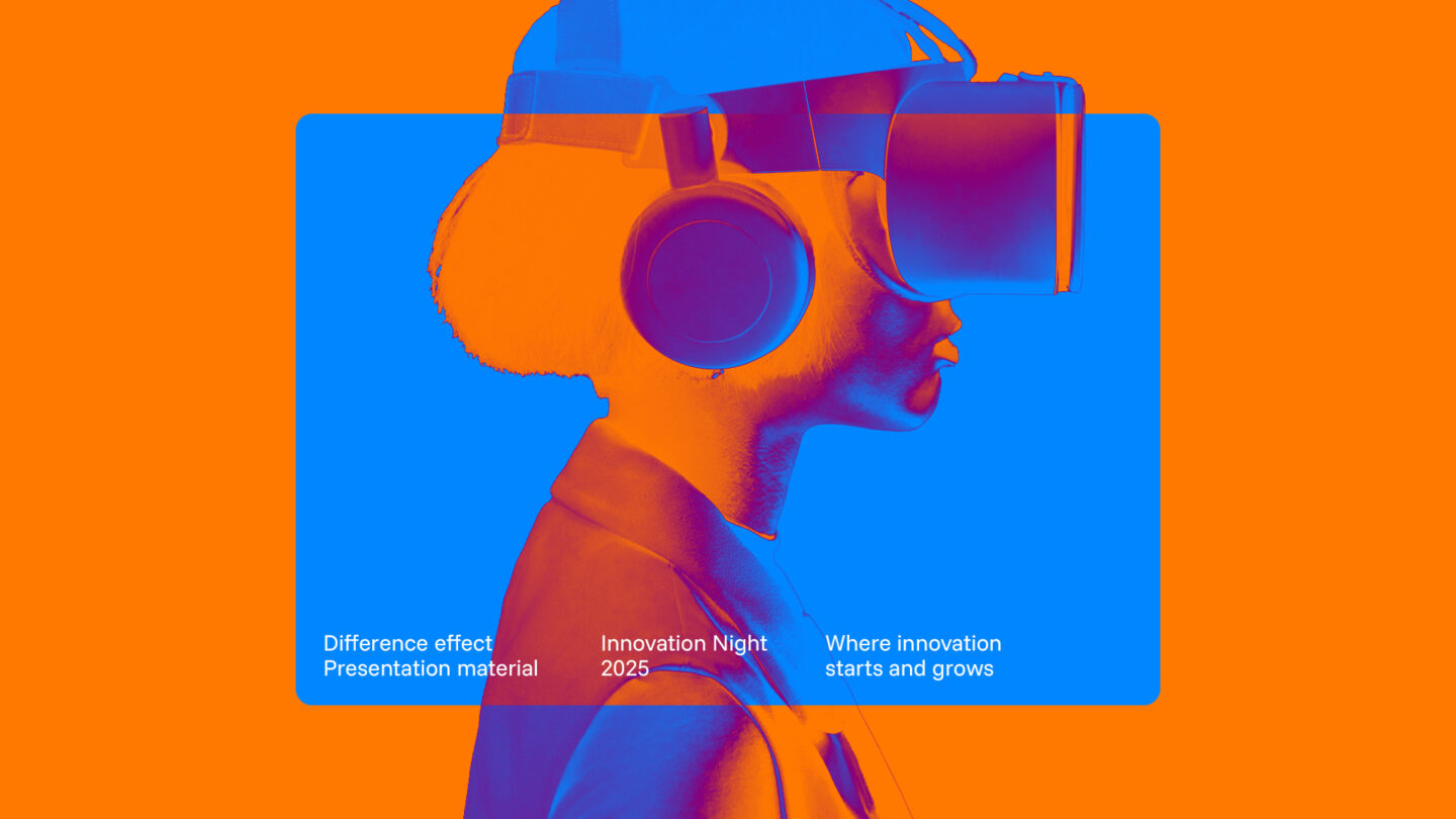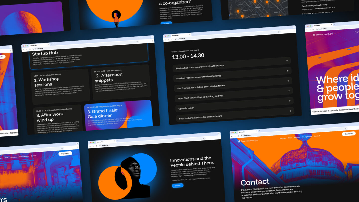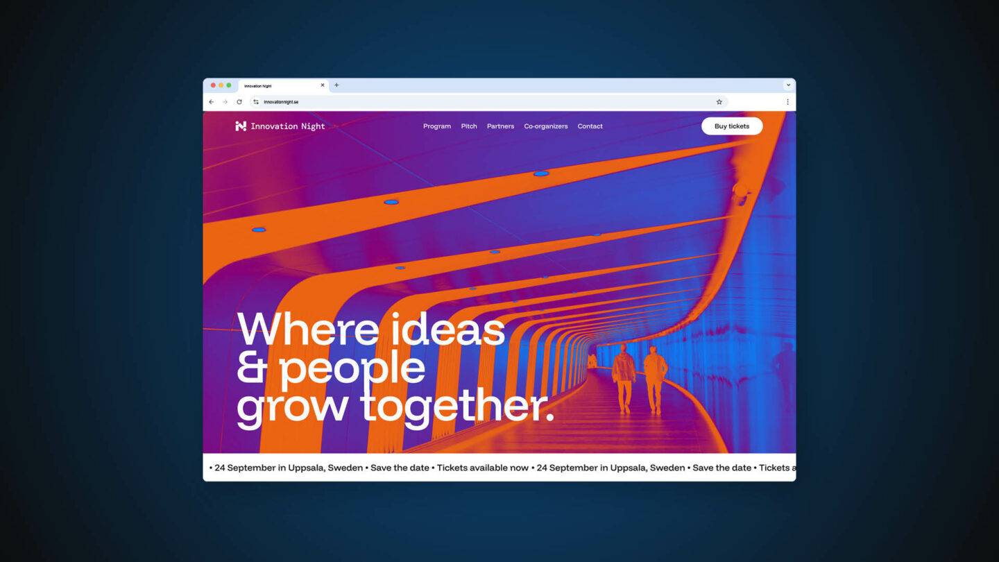 Utforska hur Innovation Nights identitet tar form i färg, form och kontrast. Här möts orange och blå i ett livfullt samspel, logotypens kedja av möten knyter ihop helheten, och den mörka bakgrunden ger uttrycket en tydlig galakänsla.