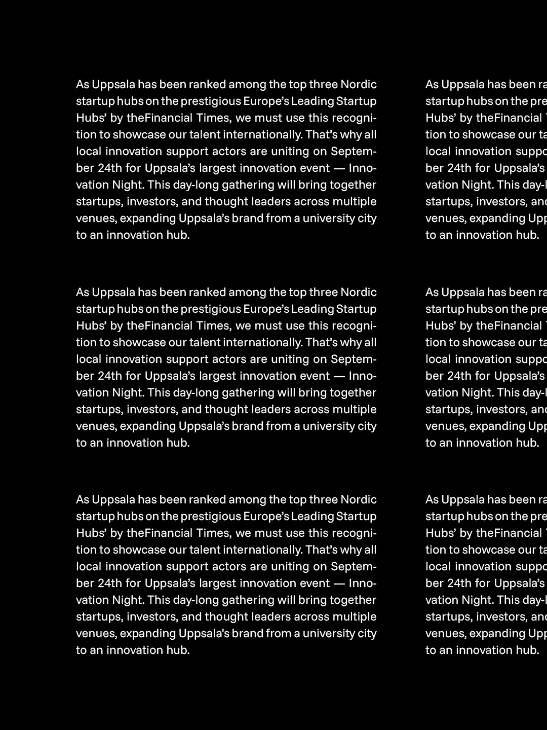 Typografin är vald för att förmedla en känsla av innovationshöjd och framtidstro. Den kombinerar skarpa linjer med ett samtida uttryck, vilket skapar balans mellan teknik och mänsklighet. Det mörka visuella anslaget, med accentfärger som bryter igenom, fungerar som en subtil flört till namnet Innovation Night och dess galakänsla.